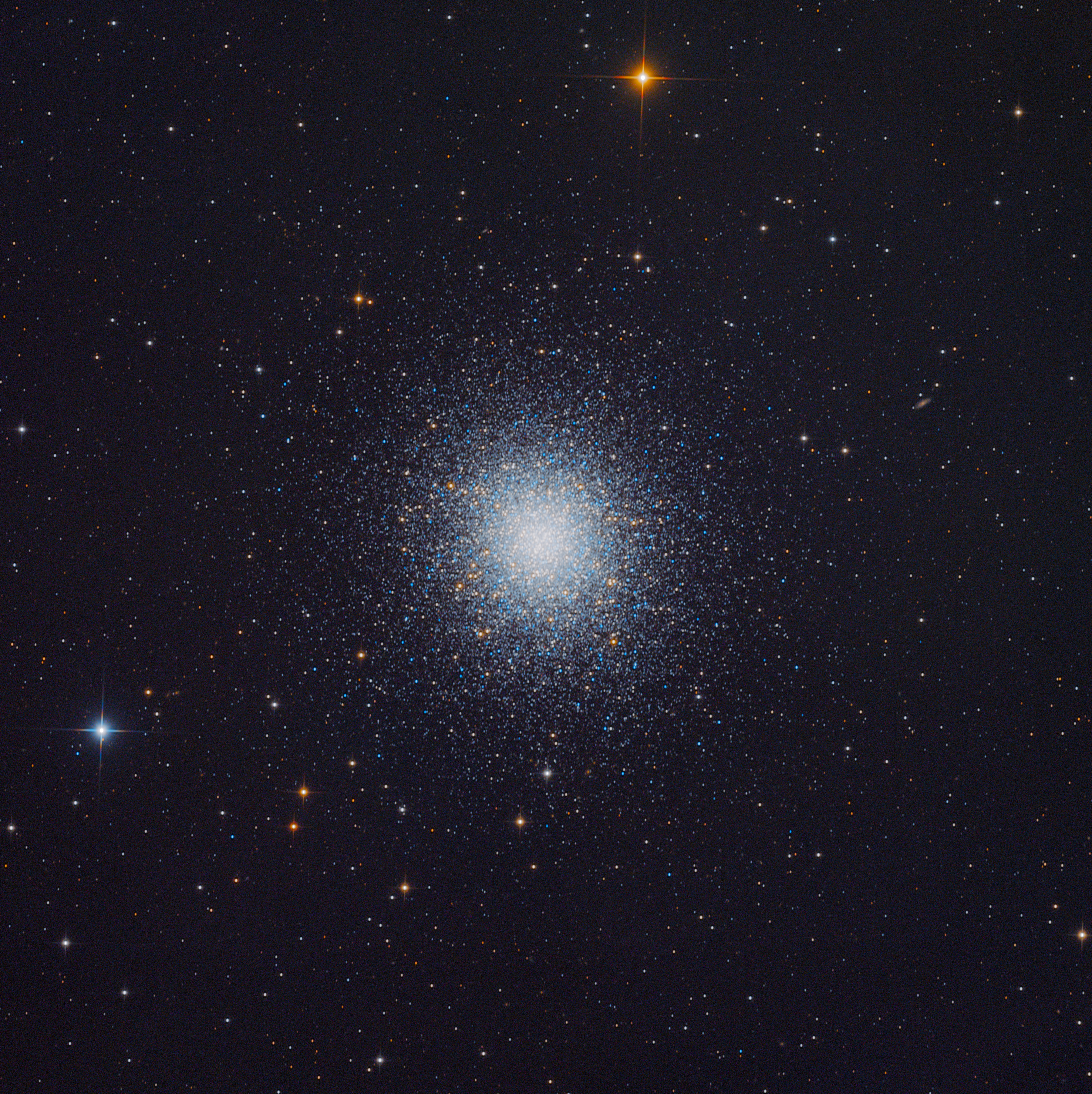 This is M13 (AKA NGC 6205), the Great Globular Cluster in Hercules (145 light years in diameter and 22500 light years away). This is a region of densely packed stars (the cluster contains over a hundred thousand of them) orbiting around our own galaxy. The majority of the stars in it are rather old (hence their yellowish color) but they are so densely packed that sometime they collide against each other. This forms new young stars, which are hotter and glow bluish. Can you see them?