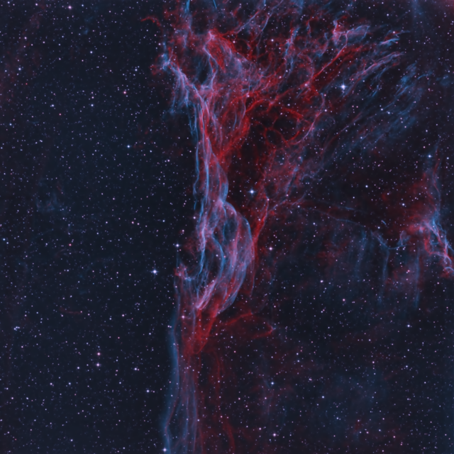 Three of the brightest complexes are the Bat Nebula (AKA NGC 6995; AKA the Eastern Veil), the Witch’s Broom (AKA NGC6960; AKA the Western veil) and the Pickering’s Triangle (AKA NGC 6979). These three photographs were taken using filters designed to enhance the glowing filaments of hydrogen: red and blue.