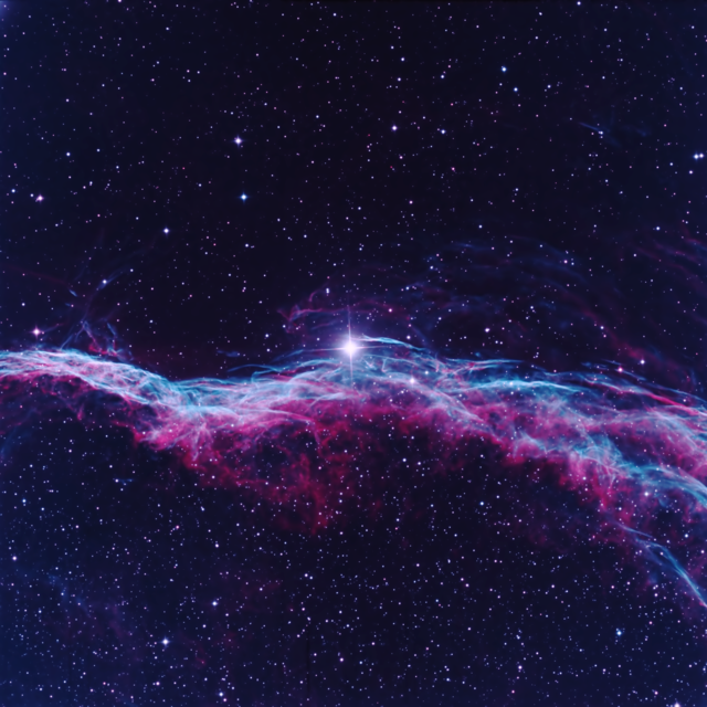 Approximately 10,000 years ago a massive star in the constellation of Cygnus the Swan went Supernova. The explosion created a roughly circular ring of remnants and shockwaves which is called the Cygnus loop. The filaments of heated gas glow and appear brighter than the surrounding material.