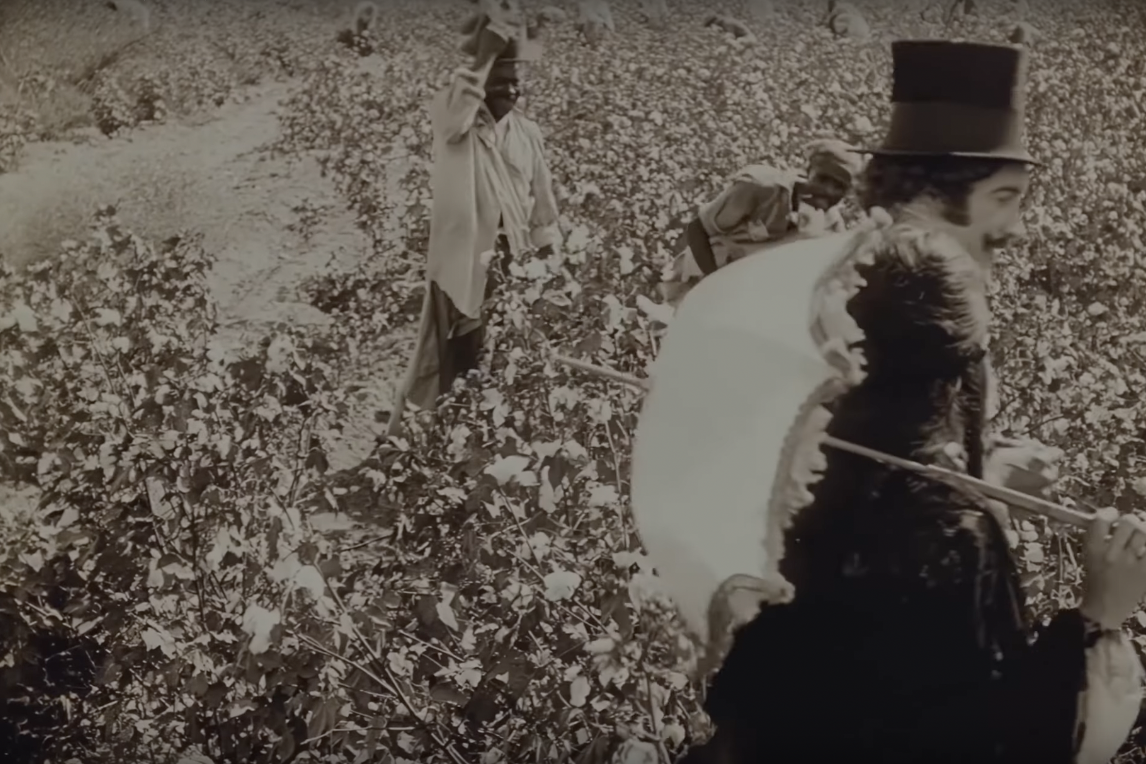 2 men of color working in a cotton field, with a well-dressed couple (man in top hat, woman holding parasol) walking by.