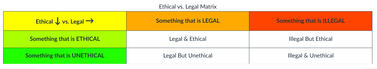 Several concepts that tend to be regularly (but incorrectly) confounded during discussions, are the concepts of something being either Ethical or Unethical, as well as that same thing being either Legal or Illegal. Ethics and Legalities are two different concepts. As you can see by the matrix above, a single item or situation can exist in any single one of the white cells.
