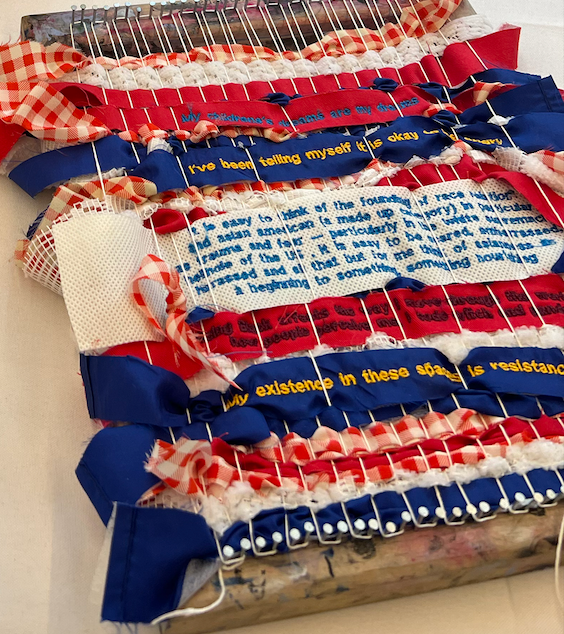 This is a final project for Carter's "Critical Approaches to Social and Cultural Theory" course. A lot of the systems she discussed with peers in class --- capitalism, systemic racism, climate change, homophobia, transphobia---are engrained in the fabric of our lives. I wanted to express this physically by weaving together words that were responses to a survey I conducted in class.