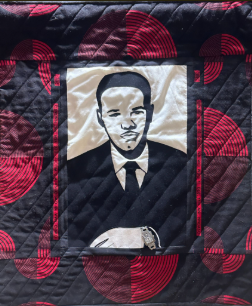 Kim F. Hall: In 2023, textile artist Sandra Ealy did a workshop for the African American Quilters of Baltimore (AAQB) on making silhouette quilts. Mom made one of Sidney Poitier and I found making digital silhouettes in preparation for appliqué strangely calming. In the months between my father passing away during a family trip and his memorial, Mom, my brother and I found it a little therapeutic to help her make this quilt of my Dad in his younger days. I still had some funeral fabric from Ghana and coincidentally, a friend of mine bought the same fabric on a trip to West Africa, not realizing it was funeral fabric. When Mom was stymied for a border, I suggested that we use it and include the uncannily appropriate selvage for an inner border. It says “OWUO BIAA YƐ OWUO NA WP WUO YI DƐƐ, YƐM ANI NNDASO” which is Twi and roughly translates to “Everyone will die, but your death was unexpected.” The watch is Mom’s.