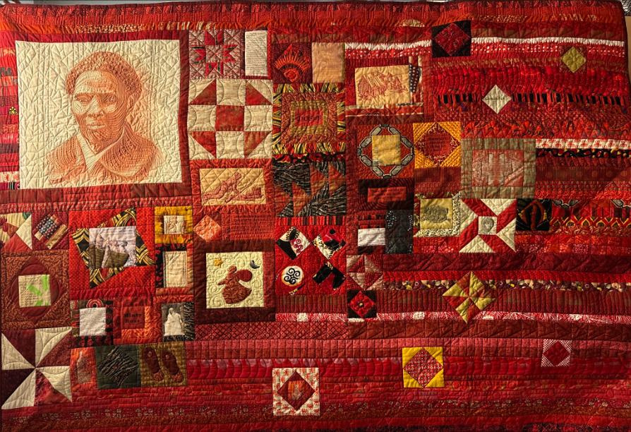Kim F. Hall: While helping my Mom organize her sewing stash, which includes fabrics related to Black history and the U.S. Civil War, I came across a print of abolitionist organizer Harriet Tubman. Mom gave it to me provided I actually made something with it. When I saw Jen Kingwell's Wanderer's Wife quilt pattern at a shop, an image of Harriet's face on a flag came to me. Inspired by Mom's using her We,Too,Sing America quilt as a teaching tool, I wanted the blocks to speak to Tubman's life and impact. The Christmas before the pandemic, we had a family trip to the Maryland Eastern shore to travel part of the Harriet Tubman Byway. Thus she was even more on my mind and it became one of my lockdown projects. I would frequently Facetime Mom to get input, but joked that I would have to stop showing her my progress because she would bring up Tubman stories that I hadn't included and would make my quilt the size of an actual flag. It has images from the Harriet Tubman Underground Railroad Museum as well as from Alison Saar’s Swing Low. The base of this Harriet Tubman memorial in Harlem (Harriet’s Escape) alternates tiles of scenes from Tubman’s life with quilt blocks, a visual biography that honors the fact that literacy was denied Tubman.