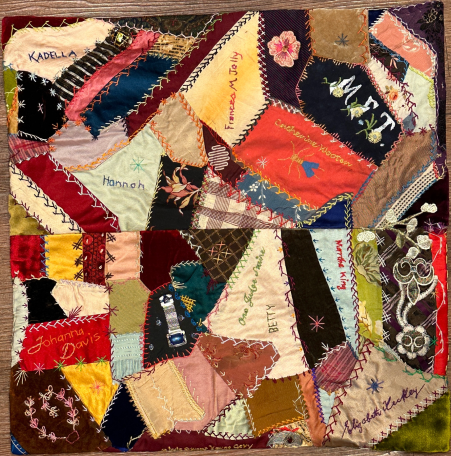 Vintage crazy quilt blocks with lace and additional hand embroidery and embellishments (the artist’s father’s cufflinks and her own old jewelry). Backed with modern silk.