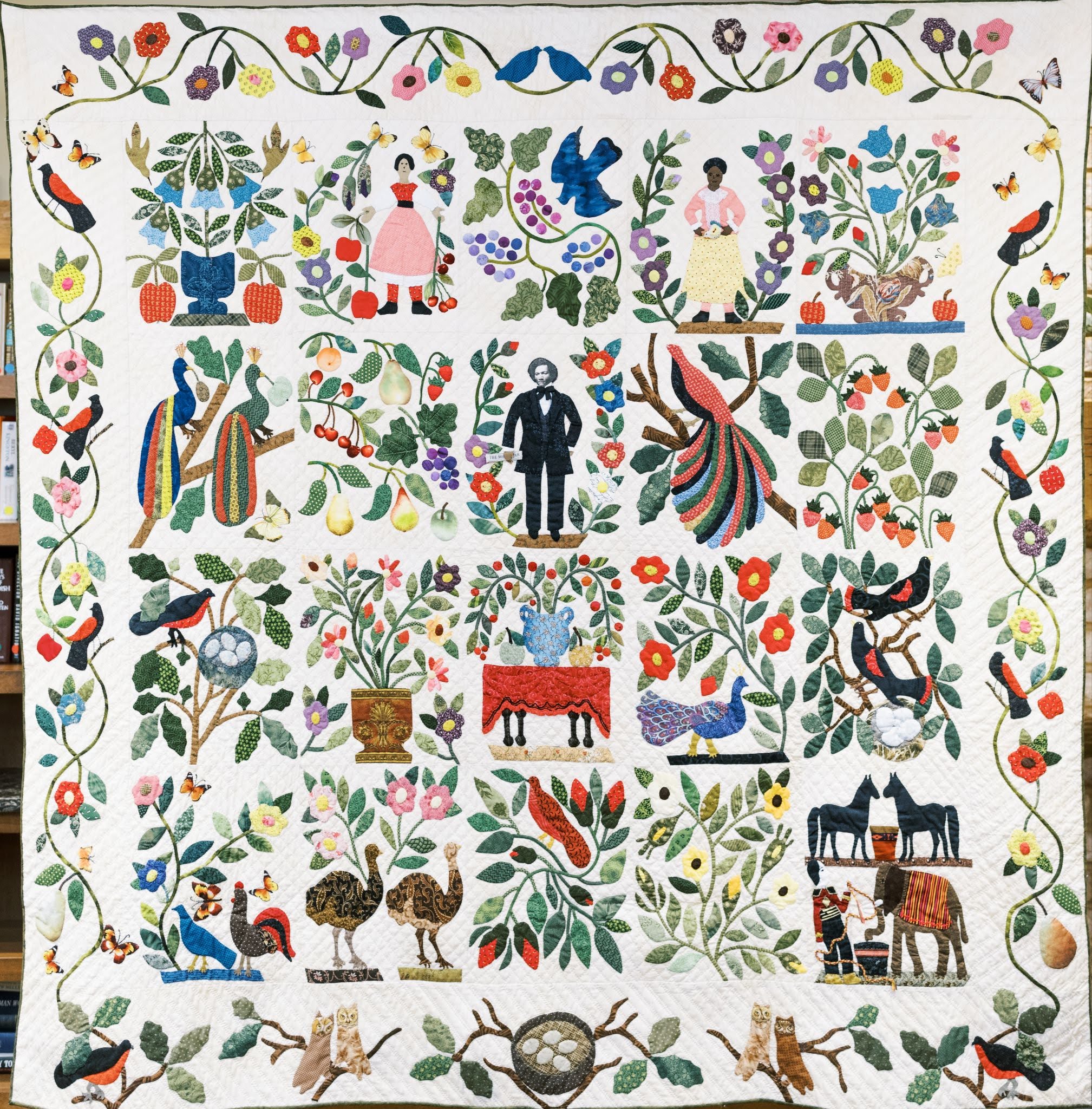 Kim F. Hall: Civil War: Devotion to Freedom is made from the Civil War Bride pattern by Corliss Searcey done in the style of the Bird of Paradise quilt owned by the American Folk Art Museum in New York City. Instead of the traditional bride and groom, Vera included original blocks depicting Frederick Douglass and Harriet Tubman. She consulted with Frederick Douglass scholar, Celeste-Marie Bernier, for the Douglass block. He holds a copy of his first antislavery newspaper,The North Star, which Professor Bernier told Vera was one of his proudest accomplishments. Harriet Tubman holds the chicken she used to distract the attention of a passing former enslaver while she was on a rescue attempt.