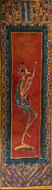 Kim F. Hall: I bought the center panel while in Accra, Ghana on the Middle Passage trip with students. I wanted it to hang in a specific spot in my apartment, but could never find time to make the design. Once again Ms. Catherine came to the rescue. I turned over the fabrics and sketch to her and it was ready by my next trip to Baltimore.