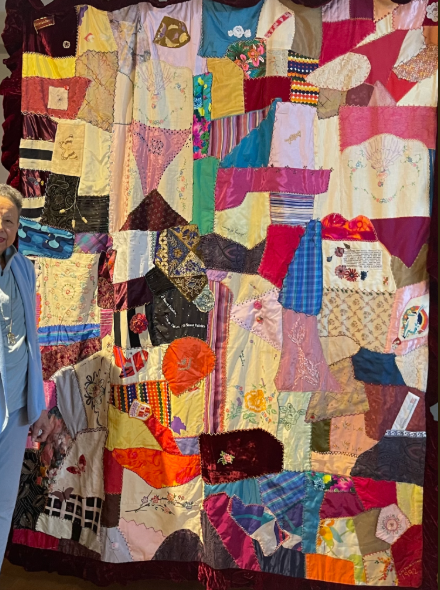 Hand sewn and embroidered with a variety of commercial fabrics. Velvet border, satin backing.