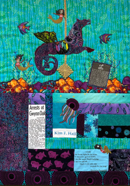 At the same time that a member of the African American Quilters of Baltimore challenged us to make a mini quilt page reflecting our quilting interests and aesthetics, I discovered that the carousel on the National Mall in Washington, D.C. was not only the site of a civil rights struggle in the Gwynn Oak amusement park near where I grew up, one of my parent’s friends was arrested trying to integrate that space. The Sea Dragon was one of the carousel animals gorgeously restored when it was moved from Baltimore to DC. and begged to be recreated in fabric. And of course you can’t have a mythical sea creature without mermaids! The mermaid “riding” the sea dragon is Sharon Langley, who was captured by a Life Magazine photographer as the first Black child to ride the carousel. The other mermaid is me at about that age. The lower half of the quilt includes part of a poem by a departed friend from Baltimore and a newspaper story about our family friend’s arrest.