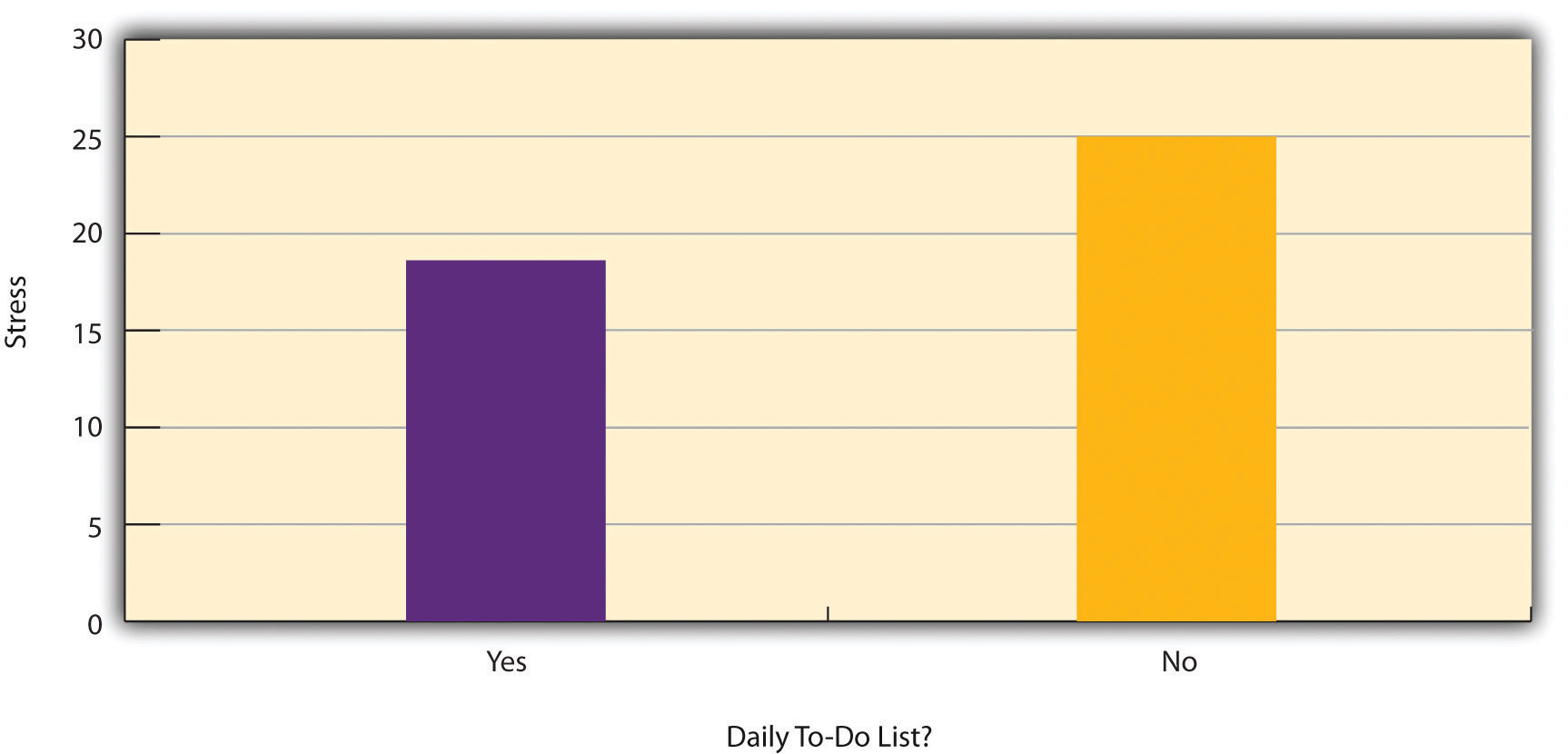Figure 6.2 shows data from a hypothetical study on the relationship between whether people make a daily list of things to do (a “to-do list”) and stress. Notice that it is unclear whether this is an experiment or a correlational study because it is unclear whether the independent variable was manipulated. If the researcher randomly assigned some participants to make daily to-do lists and others not to, then it is an experiment. If the researcher simply asked participants whether they made daily to-do lists, then it is a correlational study. The distinction is important because if the study was an experiment, then it could be concluded that making the daily to-do lists reduced participants’ stress. But if it was a correlational study, it could only be concluded that these variables are statistically related. Perhaps being stressed has a negative effect on people’s ability to plan ahead (the directionality problem). Or perhaps people who are more conscientious are more likely to make to-do lists and less likely to be stressed (the third-variable problem). The crucial point is that what defines a study as experimental or correlational is not the variables being studied, nor whether the variables are quantitative or categorical, nor the type of graph or statistics used to analyze the data. What defines a study is how the study is conducted.