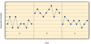 Another important aspect of single-subject research is that the change from one condition to the next does not usually occur after a fixed amount of time or number of observations. Instead, it depends on the participant’s behavior. Specifically, the researcher waits until the participant’s behavior in one condition becomes fairly consistent from observation to observation before changing conditions. This is sometimes referred to as the steady state strategy (Sidman, 1960)[1]. The idea is that when the dependent variable has reached a steady state, then any change across conditions will be relatively easy to detect. Recall that we encountered this same principle when discussing experimental research more generally. The effect of an independent variable is easier to detect when the “noise” in the data is minimized.