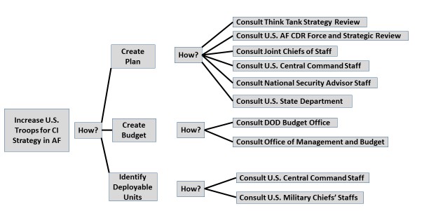 Box 9.3 details the 2009 negotiations to decide on revised U.S. troop deployments in Afghanistan (AF). During these negotiations, the U.S. DOD offered the option of 45,000 additional troops with enablers (support units) to continue a counter-insurgency (CI) strategy. A How-How analysis could have been employed by DOD planners to develop this option. From the above How-How analysis, DOD planners could generate the details of a plan to increase the number of U.S. troops in Afghanistan and pursue a CI strategy. Bob Woodward’s book Obama’s Wars 28 captures how much of the above planning took place. President Obama initiated an independent think tank review of U.S. strategy in Afghanistan in spring 2009. The U.S. Commander in Afghanistan completed a force review and second strategy review in late- summer and early-fall 2009. President Obama made his decision to increase troop deployments in Afghanistan on November 29, 2009. The main DOD actors in establishing the option for 45,000 troops plus enablers to conduct a CI strategy similar to the one successfully conducted earlier in the decade in Iraq were: Secretary of Defense, Joint Chiefs of Staff, U.S. Central Command, and the U.S. Commander in Afghanistan. Other actors in the above How-How analysis were peripheral to the DOD planning. The next step would be to take the details of an initial plan and place them through a SWOT analysis. | |