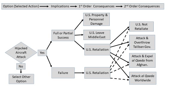 Perspective: Al Qaeda Presume that al Qaeda returns to its initial storyboard planning (see Box 8.1) to assess the implications and consequences of its preferred decision to mount suicide attacks on the U.S. homeland with hijacked aircraft employed as missiles. As Box 8.1 describes, it appears al Qaeda did not conduct such an analysis. Below are the hypothetical results if they had done so. Step 1: Select contention(s) for assessment. In this example, the contention (or decision) was to mount suicide attacks using hijacked aircraft as missiles on the New York World Trade Center, Pentagon, and U.S. Capitol. This is the only contention assessed for this example. Step 2: Create an events tree for the contention of a hijacked-aircraft attack on U.S. homeland targets. Step 3: Al Qaeda’s insights from their perspective would include that hijacked- aircraft attacks on the U.S. homeland would either be a full success, partial success, or failure. Al Qaeda already assumed the suicide attack would kill their operatives, so this consequence is not shown on the above events tree. A 1st order consequence would indicate a full or partial success would result in U.S. property and personnel damage (amount depending on level of success). Al Qaeda also assumed a full or partial success might convince the U.S. to leave the Middle East. While this was al Qaeda’s primary motive, this consequence did not come about. Also, al Qaeda should have considered U.S. retaliation for the attack. The 2nd order consequences reveal there was a small probability the U.S. would not retaliate, supported by the fact there was no U.S. retaliation for the USS Cole attack in October 2000, al Qaeda’s last major attack on U.S. interests before September 11, 2001 (9/11). Instead, the U.S. retaliated for the 9/11 attack by forcibly overthrowing Afghanistan’s Taliban government, attacking and expelling al Qaeda from its safe havens in Afghanistan, and beginning a worldwide campaign against al Qaeda. This campaign, known as “The War on Terror,” focused an extensive U.S. intelligence effort to locate al Qaeda operatives, who were then attacked by U.S. forces. Captured al Qaeda personnel were sent to the U.S. military detention camp in Guantanamo Bay, Cuba. In May 2011, this worldwide campaign against al Qaeda culminated in the death of al Qaeda leader Osama bin Laden by U.S. special forces in Pakistan. The implication of the 9/11 attack being a failure also could have resulted in U.S. retaliation, but possibly at a lower level of intensity (dashed lines in event tree) than for an attack deemed a full or partial success. Al Qaeda actions indicate their leadership was not ready to take mitigation actions if the U.S. retaliated—a major flaw in their attack plan. It appears the opportunity to make a “spectacular” attack on the U.S. homeland, and their wishful thinking concerning how this would convince the U.S. to leave the Middle East, overcame their considerations of the risk involved in a U.S. retaliation. The above events tree could be extended further to third order, fourth order, etc., consequences based on the U.S. retaliation plan against the Taliban and al Qaeda in Afghanistan and against al Qaeda worldwide. It appears that al Qaeda had not considered the full implications and consequences of attacking the U.S. homeland. | |