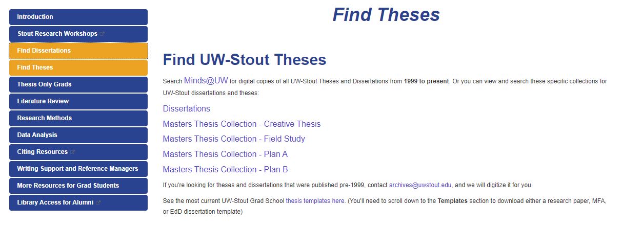 This guide will give you information on how to locate a Stout thesis or dissertation and give you more information on when your thesis or dissertation will be accessible through Minds@UW Stout.