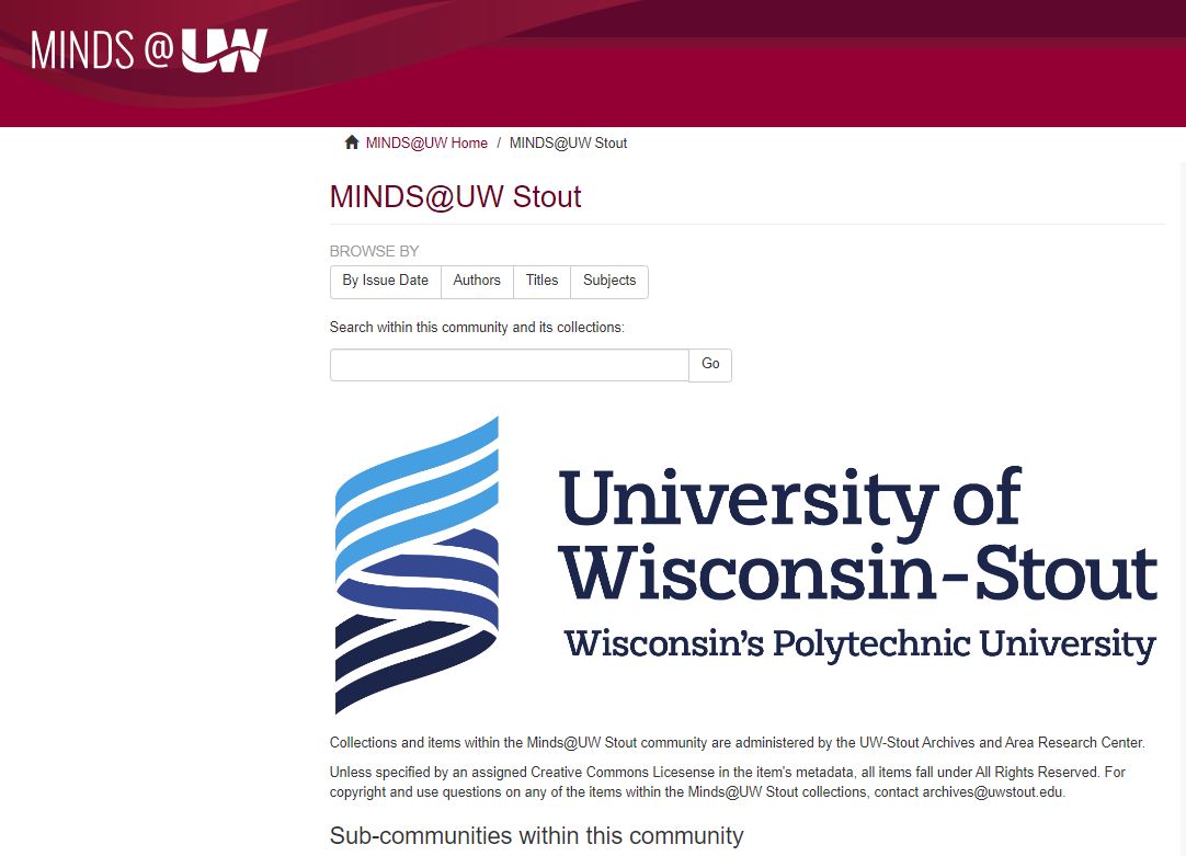 Minds@UW Stout holds UW-Stout research collections including Stout student creative and research projects, Stout faculty and staff projects, Stout theses and dissertations, and Stout interviews.