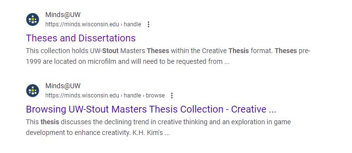 You can search for UW-Stout theses and dissertations by searching online through a search engine like Google. Look for the Minds@UW links and logos as shown in the image below. The logo is a dark blue circle with white and green squares. This will ensure that you are looking at a Minds@UW Stout record.