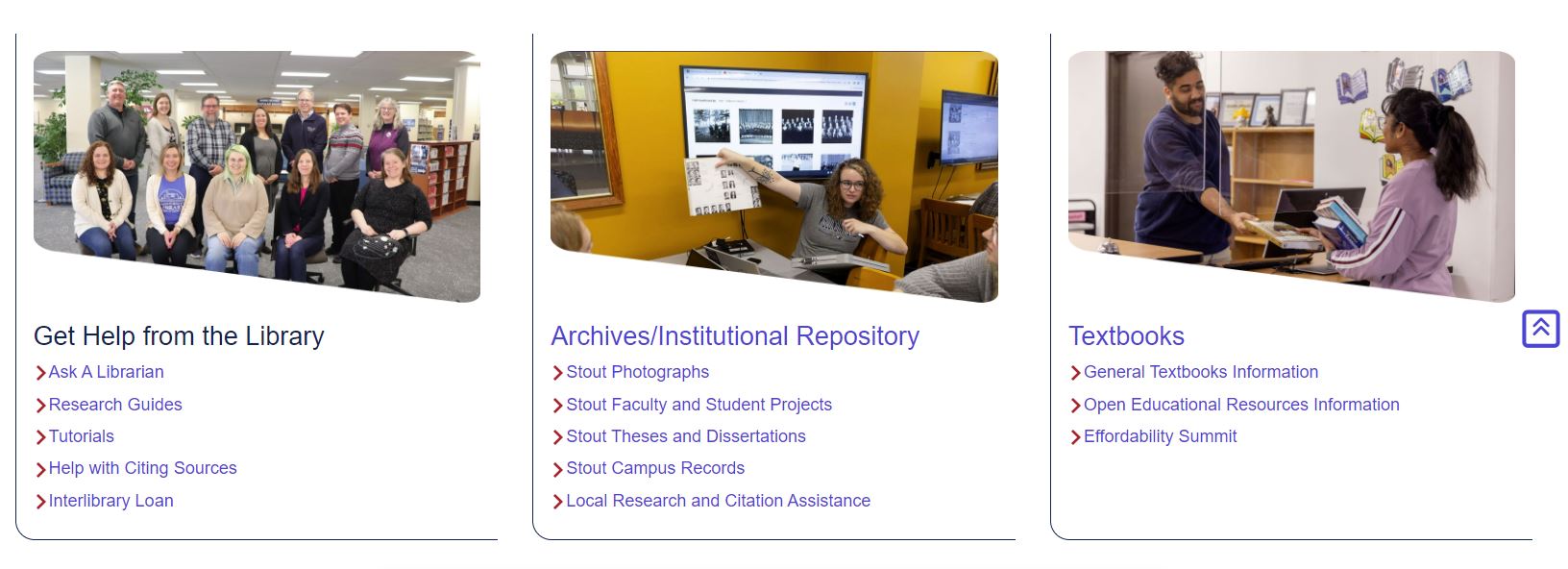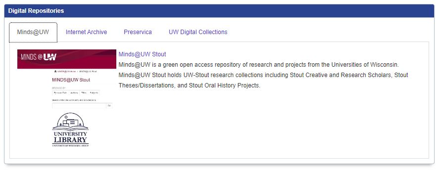 You can access the UW-Stout Archives website here: UW-Stout Archives. On the front page of the website, there is a blue circle icon with a category entitled, 'Digital Collections.' Select this link. it will take you to a digital collections guide. Select the digital repository listed entitled, 'Minds@UW Stout'.