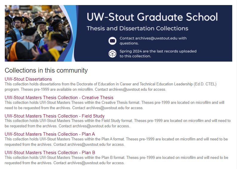 Select the Theses and Dissertations community listed in Minds@UW Stout. This will take you to a list of all the different theses and dissertations created at UW-Stout. There is a banner at the top of the page that will indicate the last time that the theses and dissertations collection has been updated. This will help you if you are looking specifically for your thesis or one that was recently finished.
